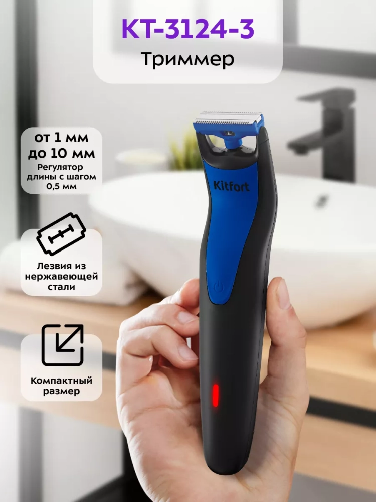 Триммер Kitfort KT-3124 — это прибор для бритья, стрижки и подравнивания бороды, усов или бакенбард. Лезвия из нержавеющей стали обеспечивают качественное и тщательное удаление волос. Корпус триммера ненамного больше обычного бритвенного станка, что позволяет брать его с собой в командировки, походы и путешествия.