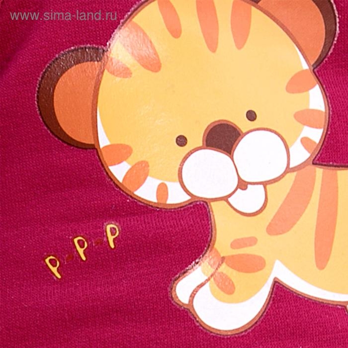 - На Басике футболка с длинным рукавом, сшитая из трикотажа цвета вишни. Футболку украшает термонаклейка в виде забавного рыжего тигрёнка.