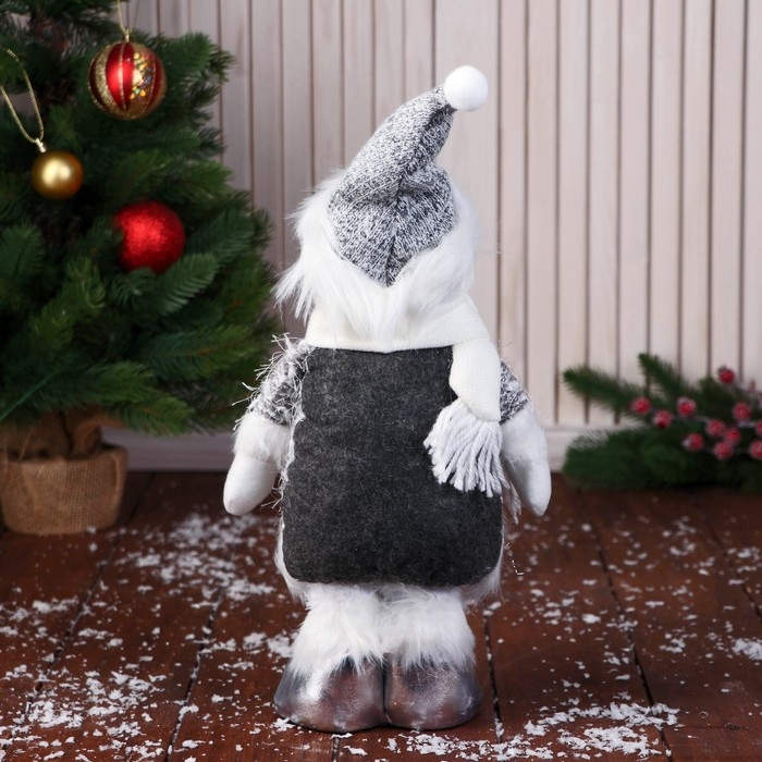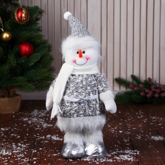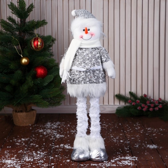 Мягкая игрушка "Снеговик в колпаке и шарфике, длинные ножки" стоит, бело-серый