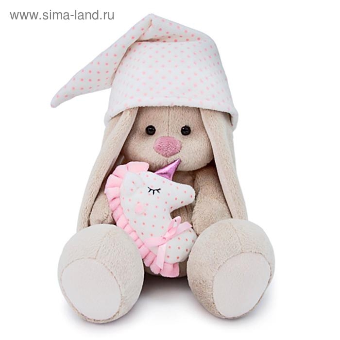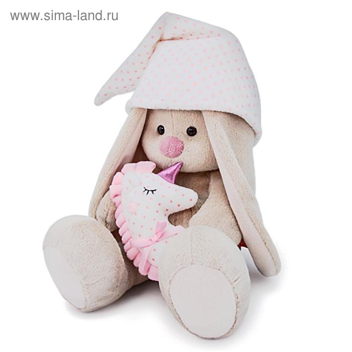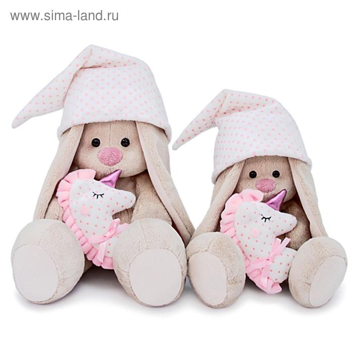 Милая мягкая игрушка «Зайка Ми» — это хороший подарок для ребёнка или кукольного коллекционера. Зайка в комплекте для сна: в лапках игрушки милая подушка в виде спящего единорога, которая сочетается с белым колпаком в розовый горошек. Колпак можно снять.