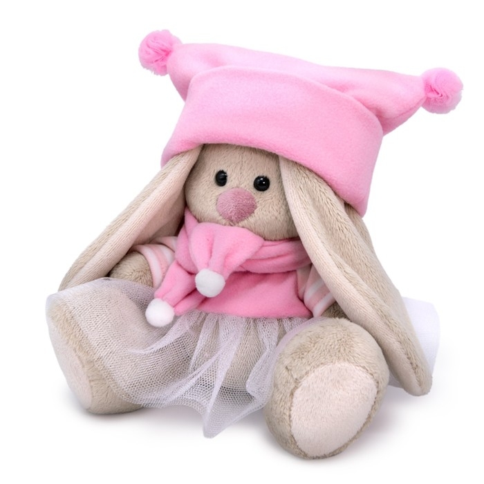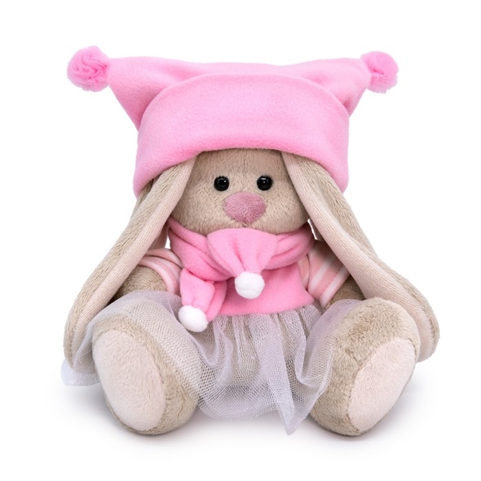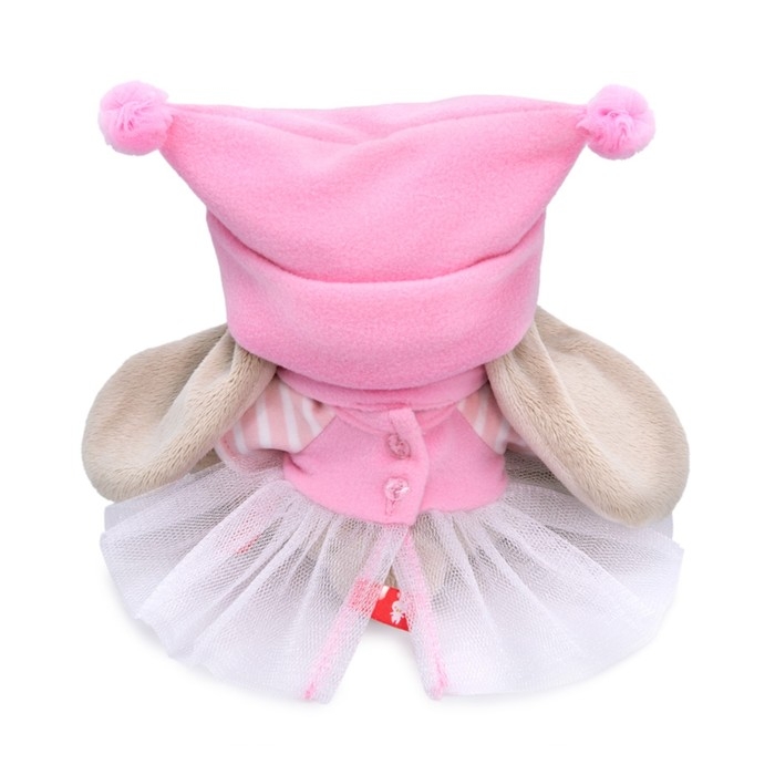 - На зайке платье из розового софта с рукавчиками из трикотажа в бело‑розовую полоску и с пышной юбочкой из белой тончайшей сеточки. Шапочка выполнена из софта цвета розового леденца.Также в комплекте шарфик из софта с белыми помпонами на концах.
