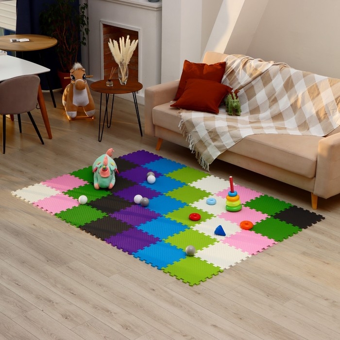 - Комплект состоит из 9 частей размером 33 × 33 см. Общая площадь коврика составляет 1 м2.