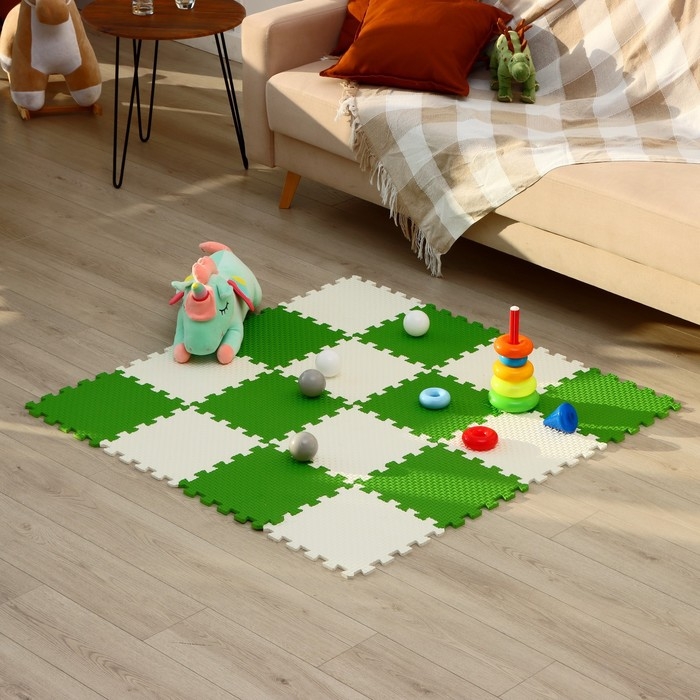 - Комплект состоит из 9 частей размером 33 × 33 см. Общая площадь коврика составляет 1 м2.
