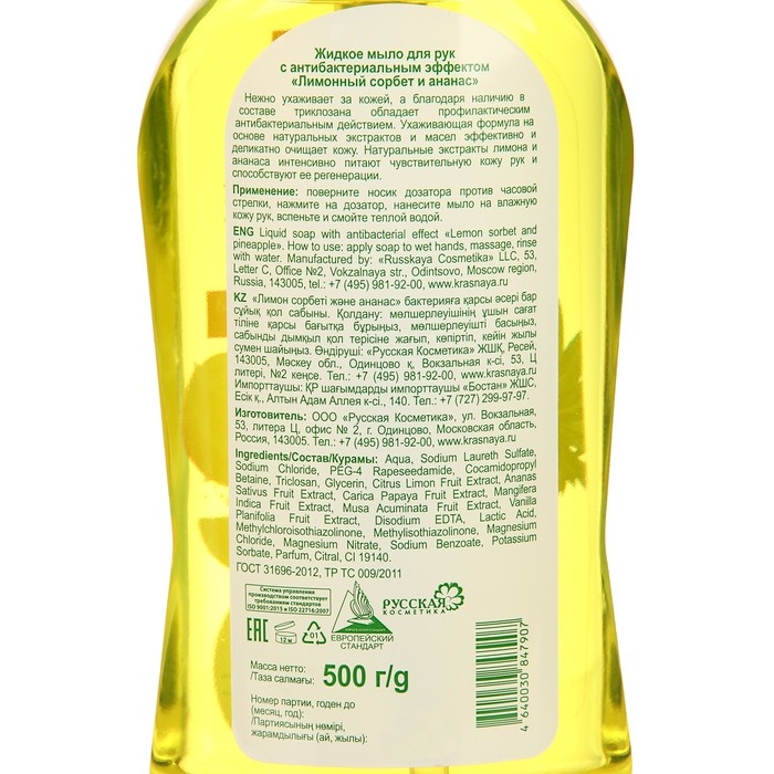 Мыло жидкое Красная линия "Лимонный сорбет и ананас" с антибактериальным эффектом, 500 гр