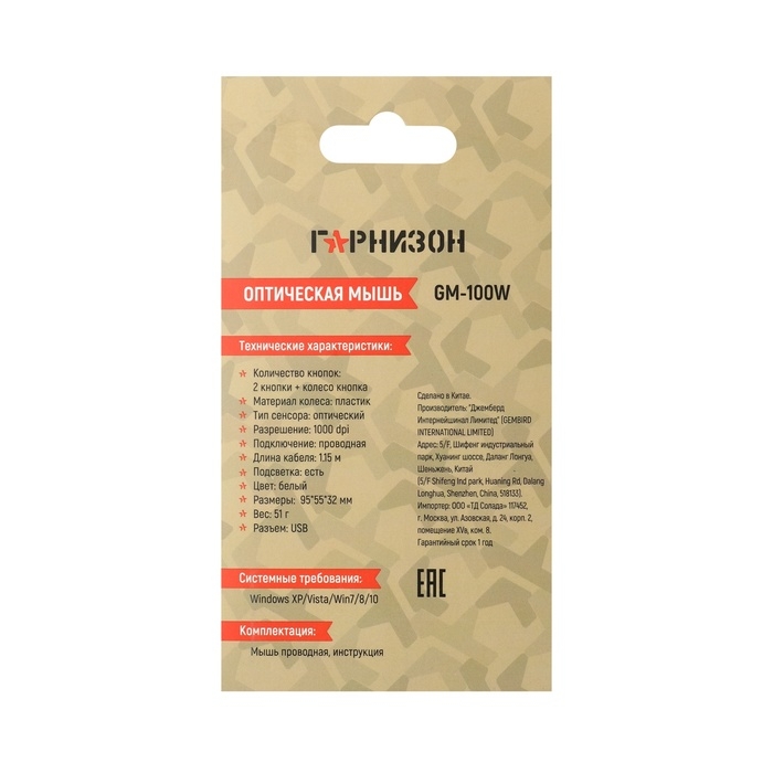 Мышь Гарнизон GM-100W, проводная, оптическая, 1000 dpi, USB, белая