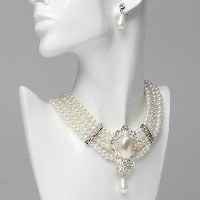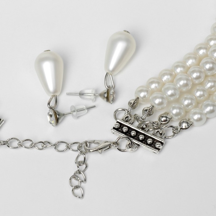 Набор 2 предмета: серьги, колье «Леди» 4 нити, цвет белый в серебре, 45 см