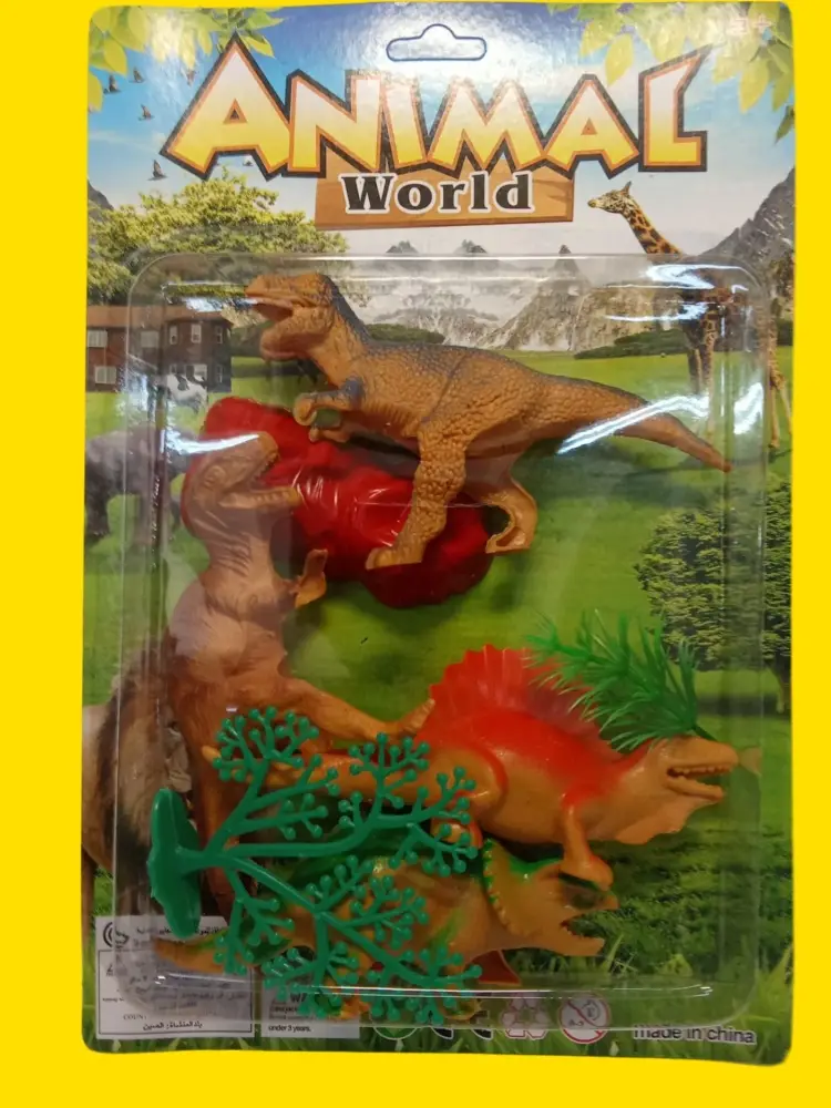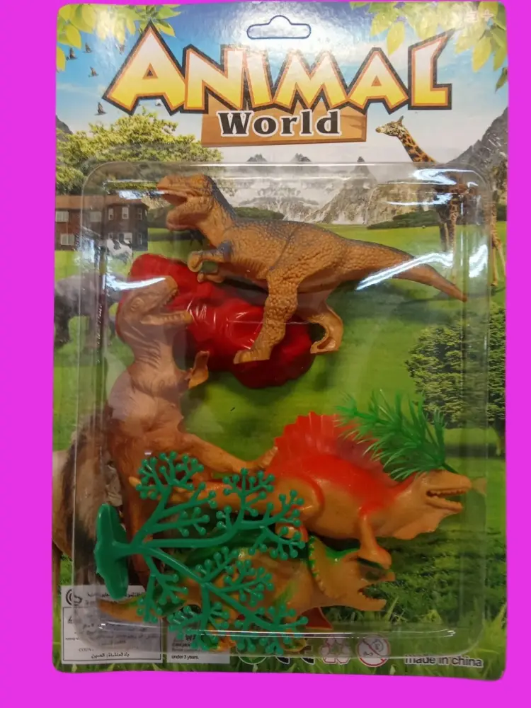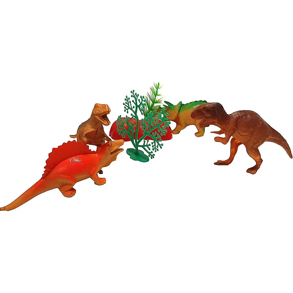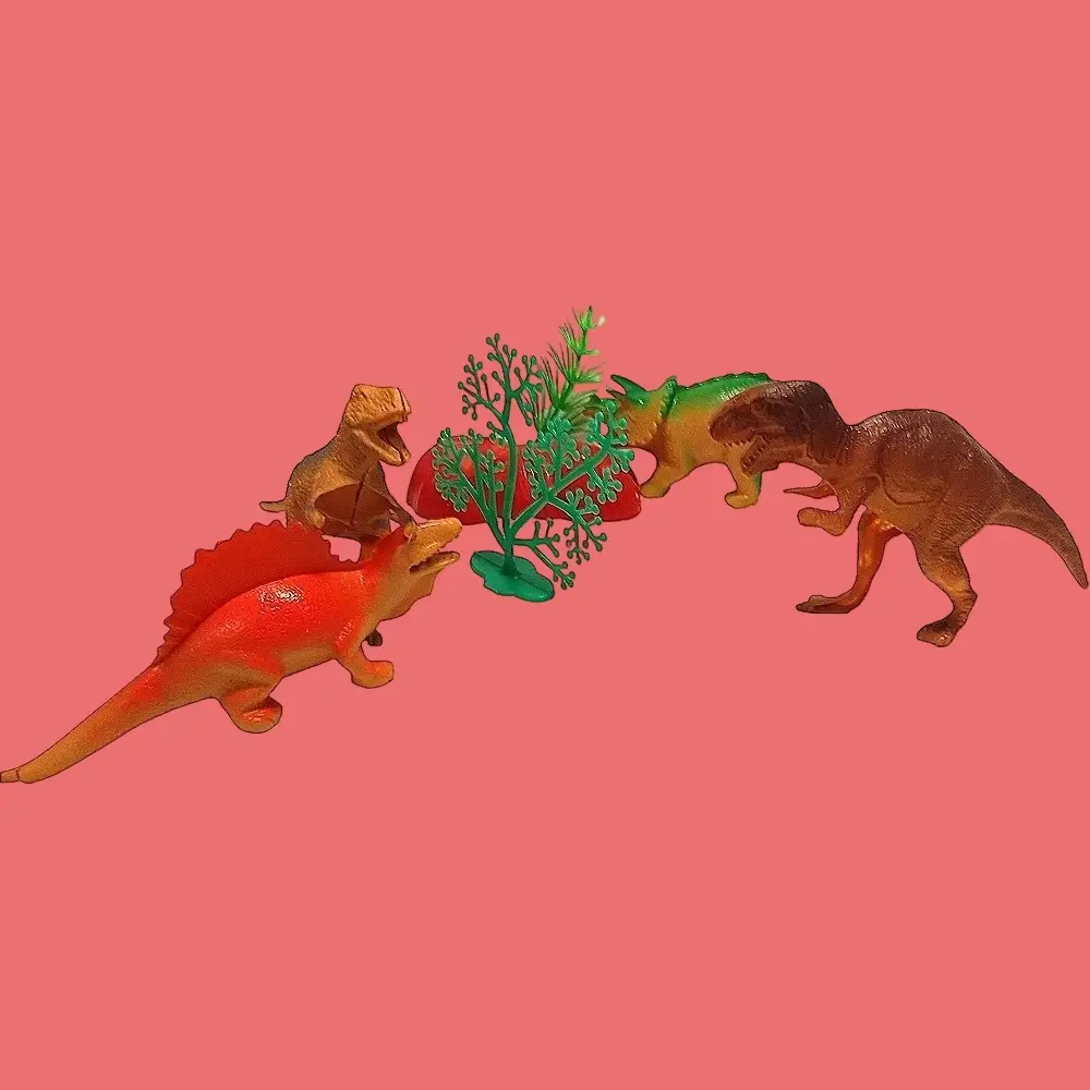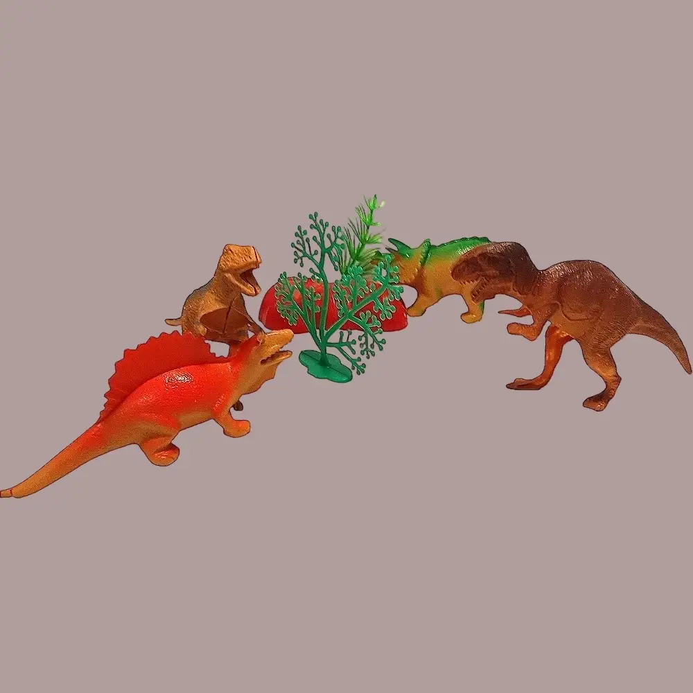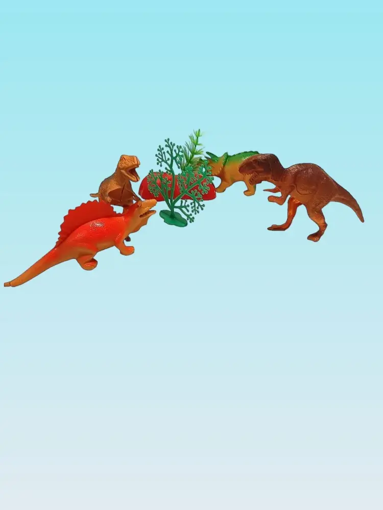 Представь: набор из четырёх реалистичных динозавров (тираннозавр, стегозавр, трицератопс, велоцираптор — или другие, но всегда крутые!). Каждый — размером 10–10 см, детально проработан: чешуя, зубы, даже выражение "лица".