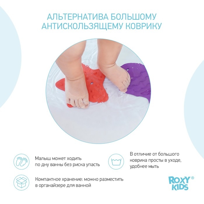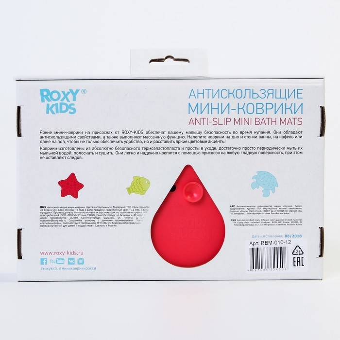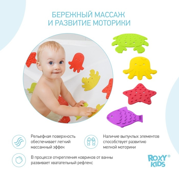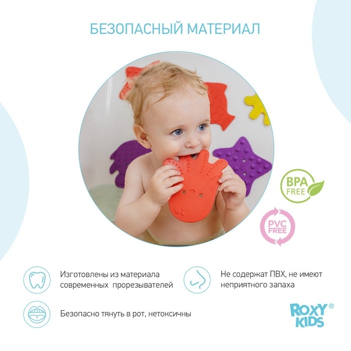 Мини коврики для ванной от ROXY-KIDS произведены в России из современного и безопасного материала ТЭП. Этим коврикам можно найти множество применений. Мини-коврики станут отличной заменой большому коврику, который неудобно промывать и сушить. Также их используют как массажеры, потому что рельефная поверхность обеспечивает бережный массаж стоп и ладоней. Ребенок может грызть их, потому что они изготовлены из специального безопасного материала. Ими можно также украсить интерьер, налепив коврики на дно и стенки ванны или кафель, чтобы не только обеспечить удобство, но и расставить яркие цветовые акценты. Кроме того, эти мини-коврики абсолютно не пахнут, потому что не содержат ПВХ. Для ухода их достаточно просто периодически промывать с мылом, полоскать и хорошо сушить. Они легко и надежно крепятся с помощью присосок на любую гладкую поверхность, при этом не оставляют следов. В ассортименте есть несколько наборов ковриков.