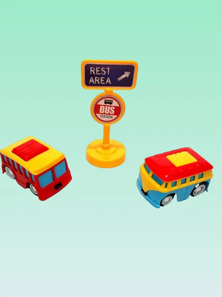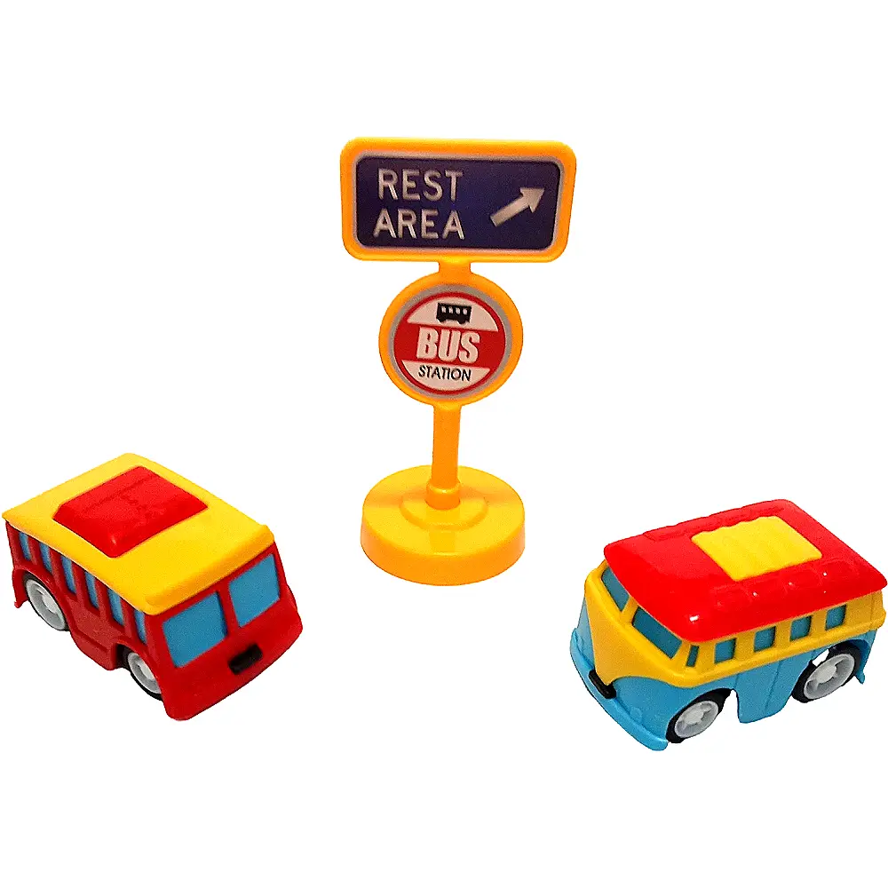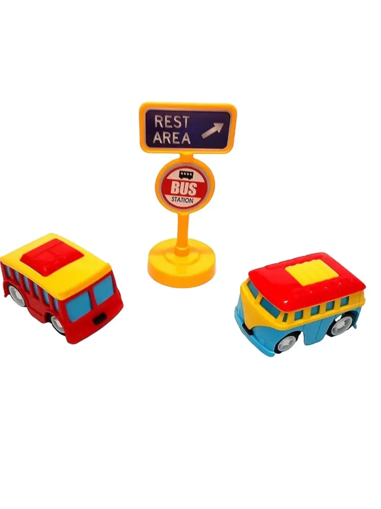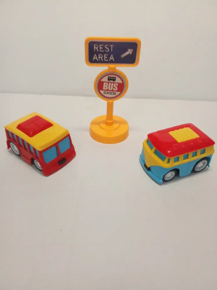 Комплект из трёх разноцветных автобусов (размер 10 см) с подвижными колёсами. Идеален для ролевых игр: