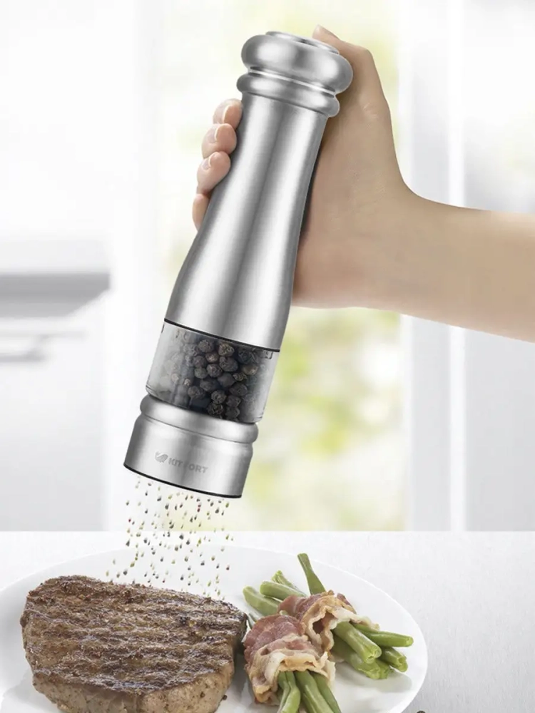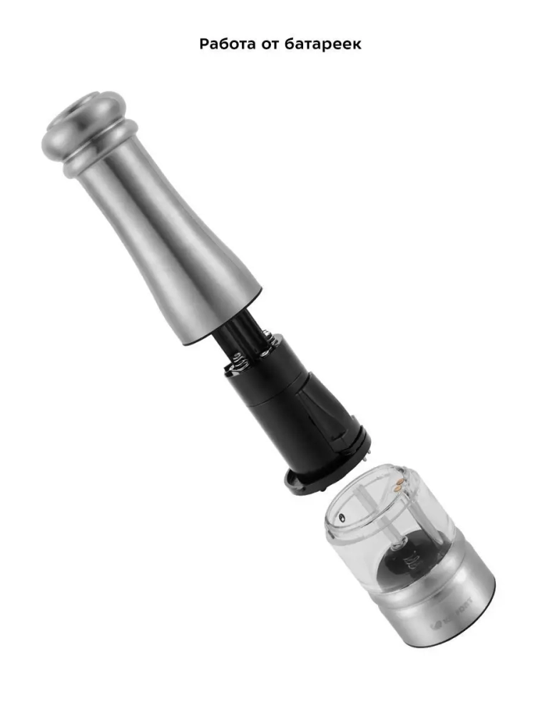 Электрическая мельница Kitfort KT-2030 измельчает перец-горошек, соль и другие специи. Установлены конические жернова из керамики, они долговечные, не стираются и не ржавеют. Мельница удобно лежит в руке, включается одной кнопкой и работает от 6 батареек типа ААА, которых хватает на долгое время. Нет нужды молоть специи впрок. Мельница одновременно мелет и дозирует. Поместите ее над блюдом и нажмите кнопку. Во время помола снизу загораются светодиоды, они освещают блюдо, чтобы вам было лучше видно количество специй. Поскольку чаще всего из специй используют соль и перец, мы положили в комплект две мельницы. Вы можете использовать набор мельниц как солонку и перечницу на столе, и у вас будет возможность посыпать готовые блюда свежемолотыми специями.
