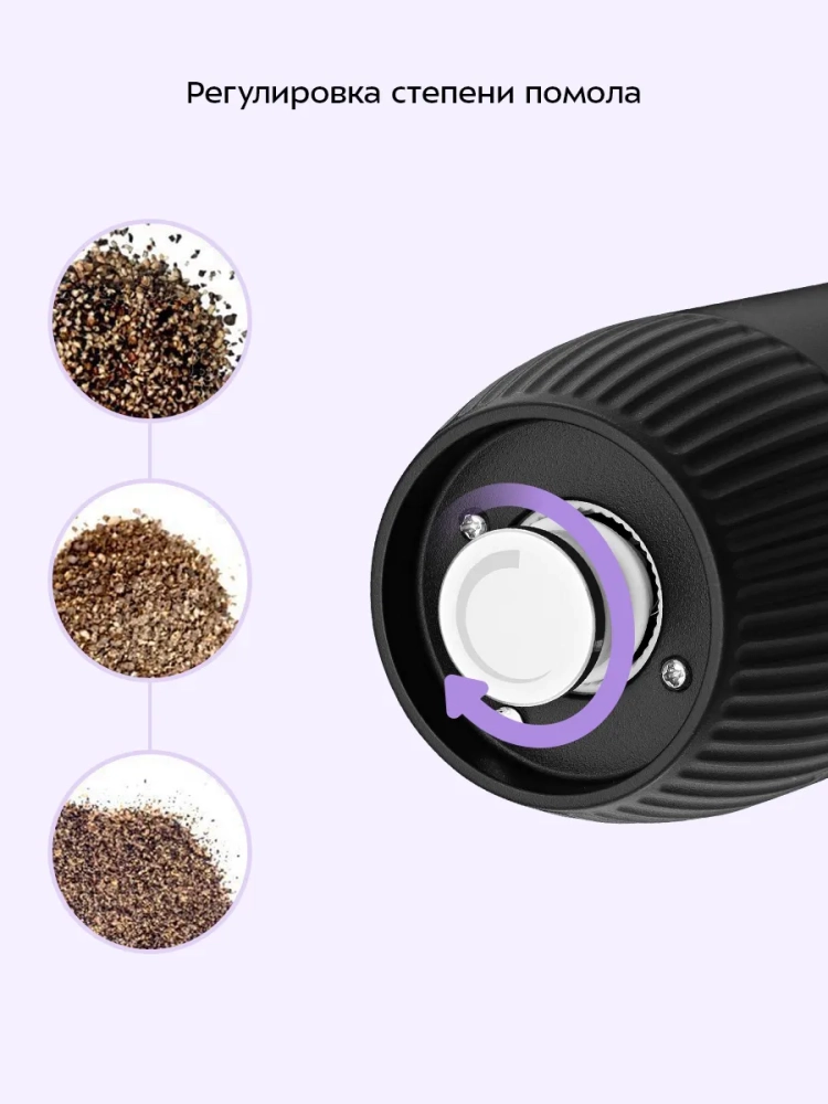 Степень помола специй регулируется винтом. Устройство имеет конические жернова из керамики. Они долговечные: не стираются и не ржавеют. Мельница удобно лежит в руке и работает от аккумулятора.
