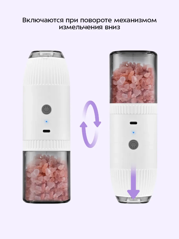 Использовать автоматическую мельницу очень удобно: устройство начинает измельчение, когда вы переворачиваете его механизмом измельчения вниз. Поместите устройство над блюдом и переверните, чтобы получить быстрый помол, не прикладывая никаких усилий. Во время помола снизу загорается подсветка, благодаря которой лучше видно количество смолотых специй.