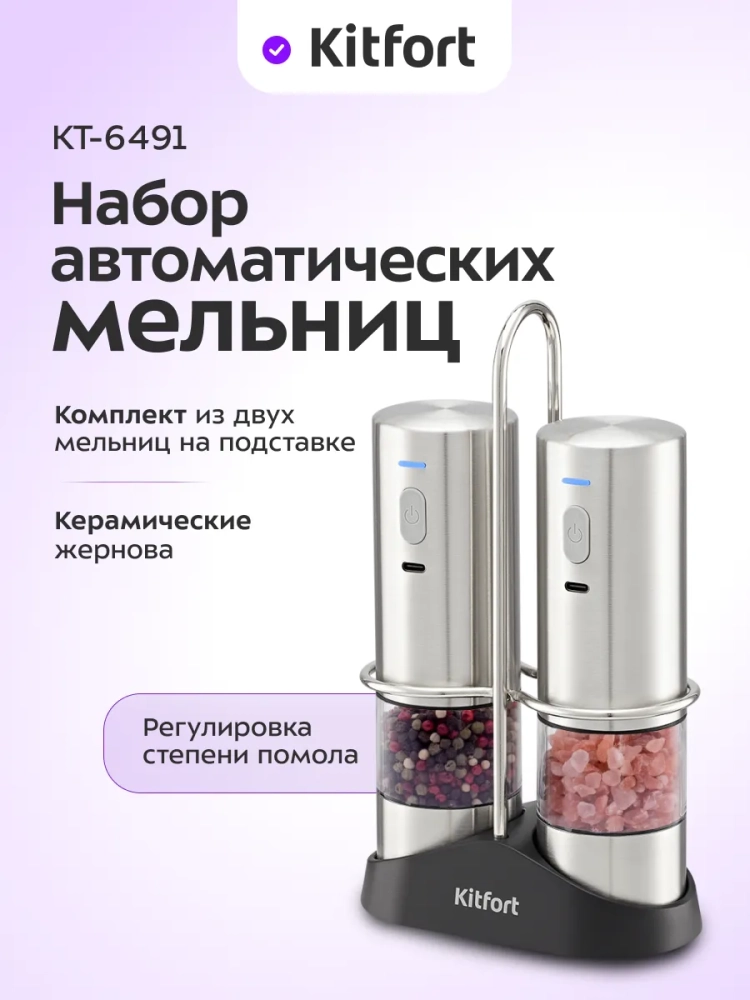 Набор Kitfort КТ-6491 состоит из двух автоматических мельниц на подставке. Вы можете использовать набор мельниц как солонку и перечницу на столе, и у вас будет возможность добавить в готовые блюда свежемолотые специи. В отличие от специй, которые хранятся в уже измельченном виде, свежемолотые специи имеют более яркий и насыщенный вкус и аромат.