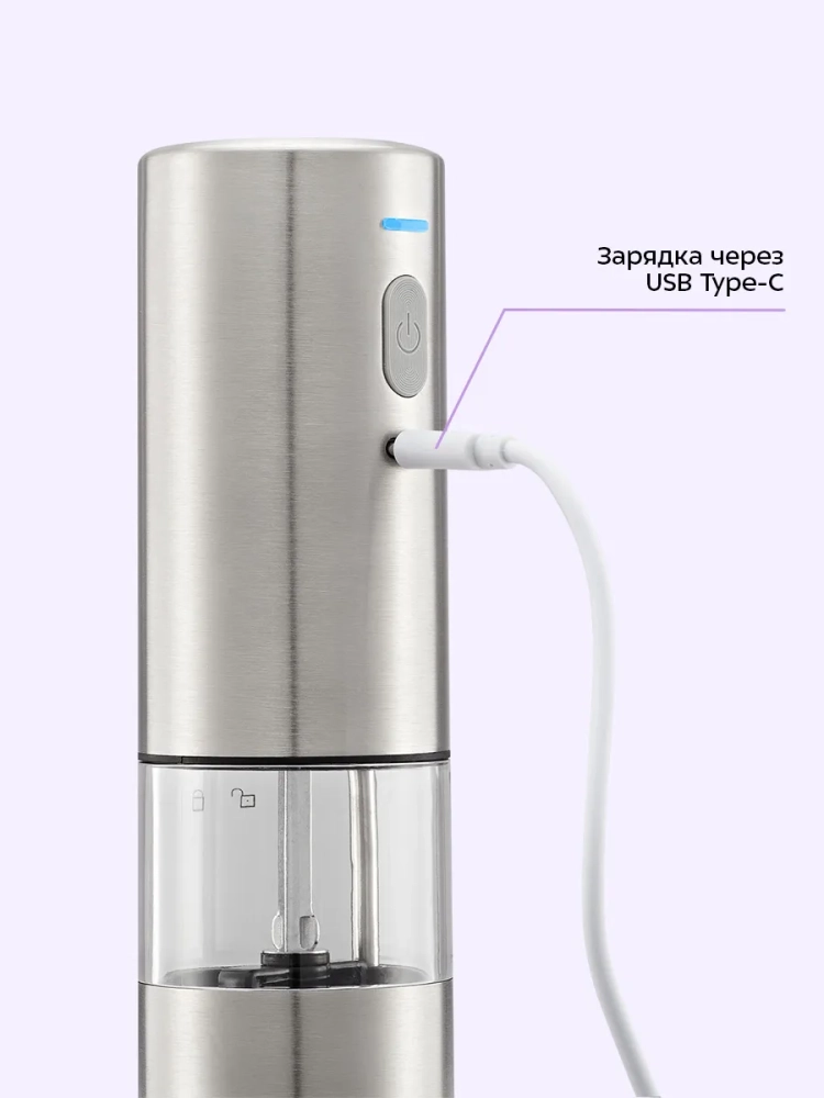 Использовать автоматическую мельницу очень удобно: поместите устройство над блюдом и нажмите на кнопку, чтобы быстро смолоть специи, не прикладывая никаких усилий. Во время помола снизу загорается подсветка, благодаря которой лучше видно количество смолотых специй.