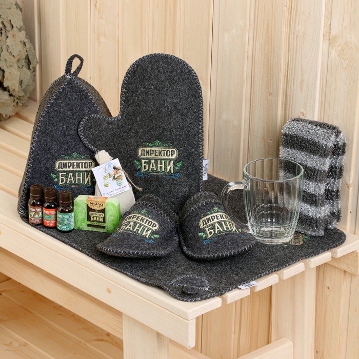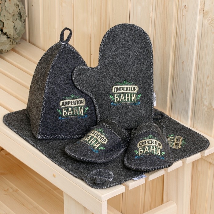 Набор для бани 5 предметов (портфель, шапка, тапочки "Директор бани", варежка, коврик) серый