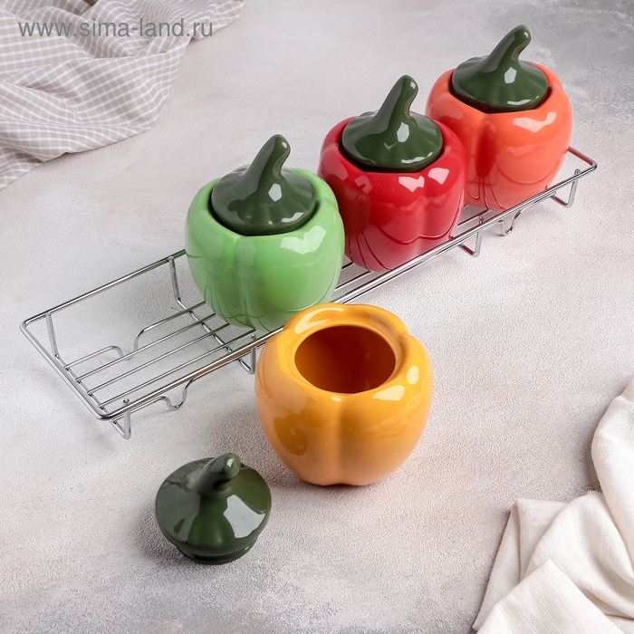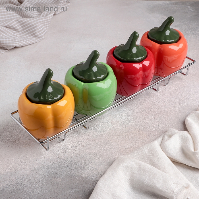 Набор банок керамических для сыпучих продуктов на металлической подставке «Перцы», 4 предмета: 400 мл