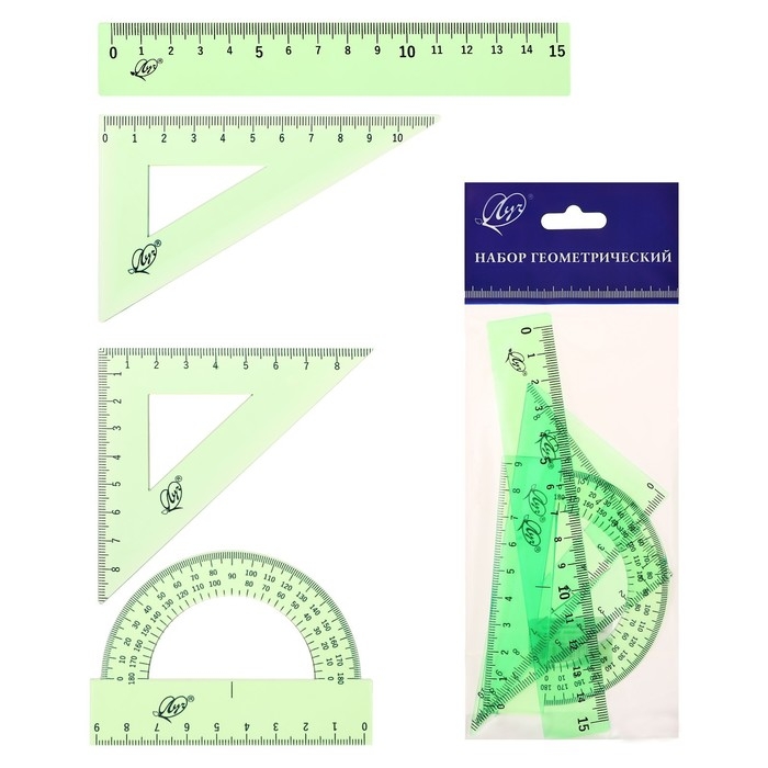 Набор чертёжный 4 предмета (линейка 15 см, угольник 30 °/ 60 °, 10 см; угольник 45 °/ 45 °, 8 см; транспортир 180 °, 9 см), прозрачный зелёный