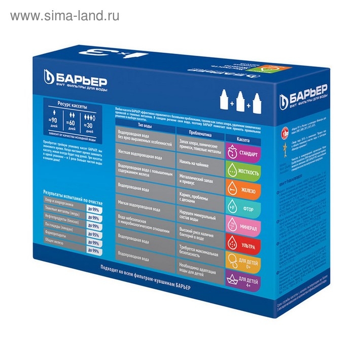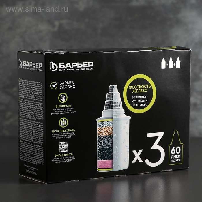 Картридж подходит для любых фильтров-кувшинов «Барьер». Каждая кассета рассчитана на обработку 350 литров.