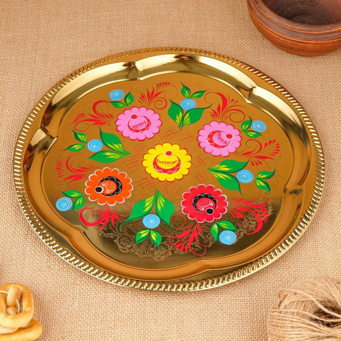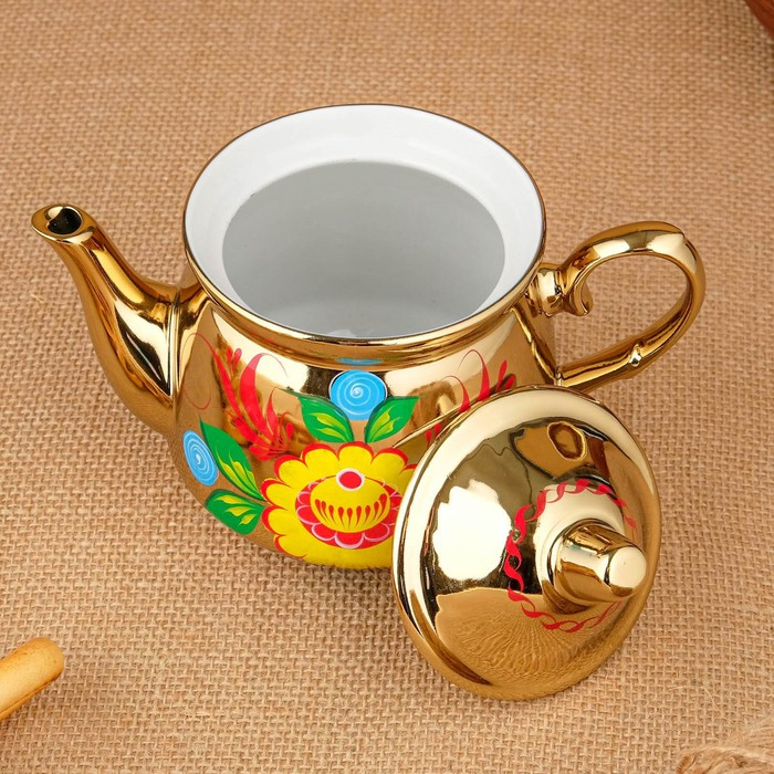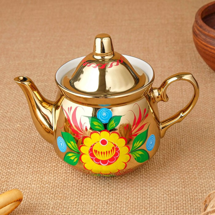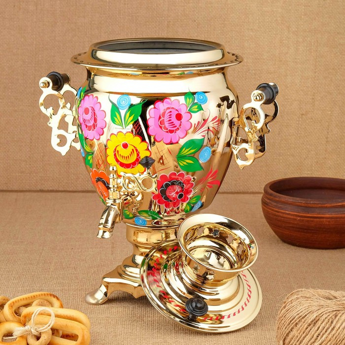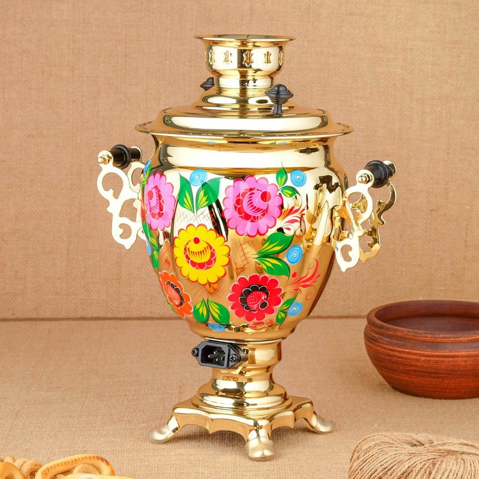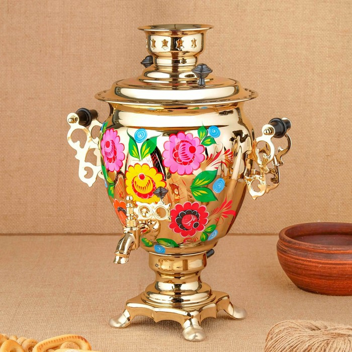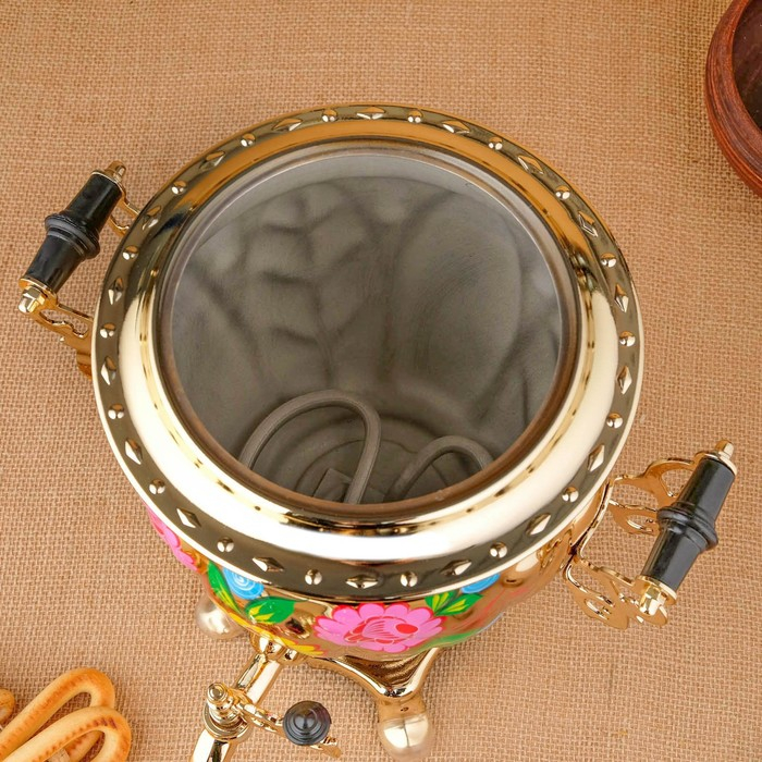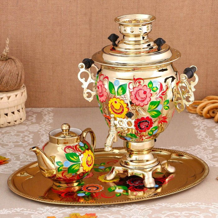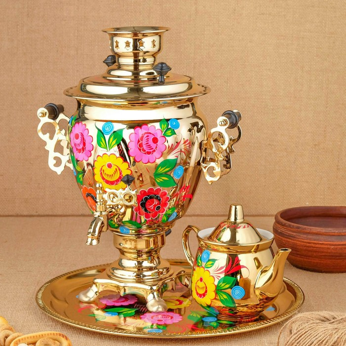 Набор «Цветы на золотом», жёлудь, 3 предмета, самовар 3 л, заварочный чайник 0,7 л, поднос