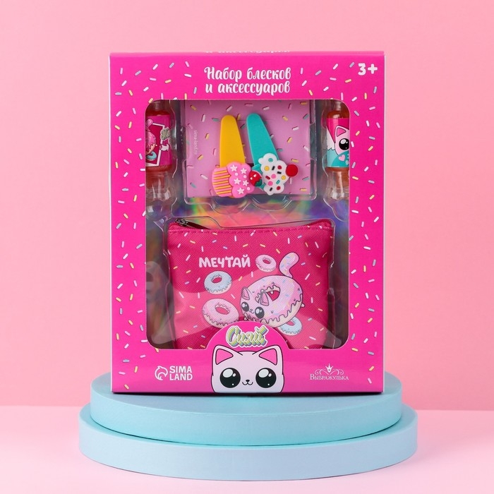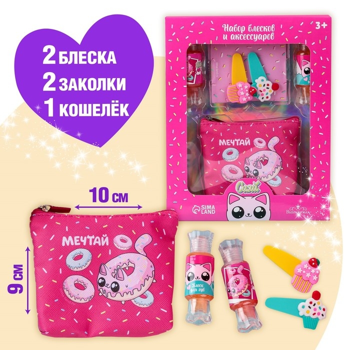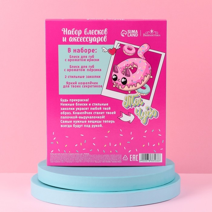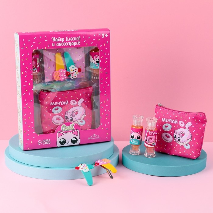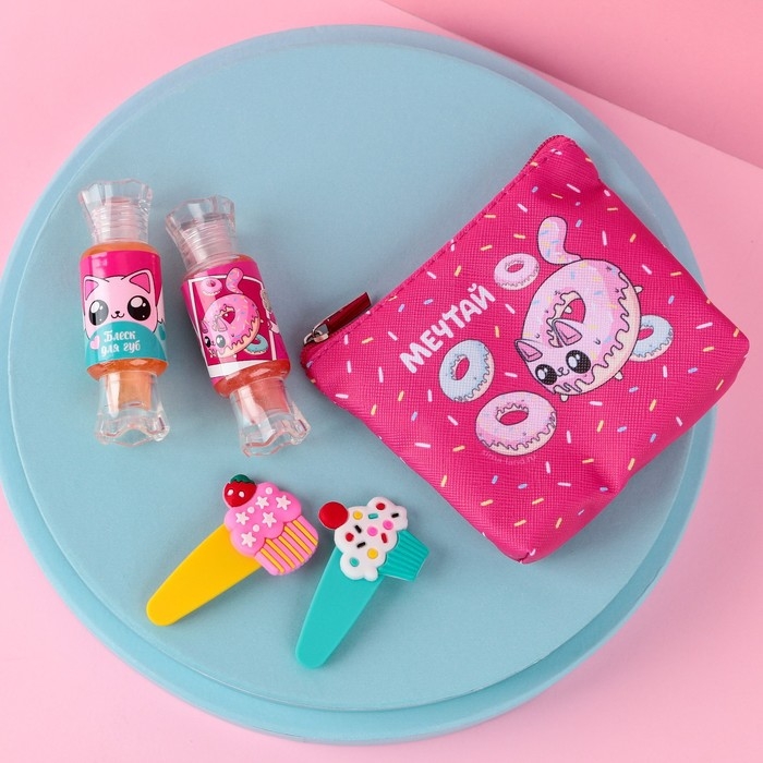 Набор детской косметики «Сладкие котики», блески для губ, косметичка, заколки