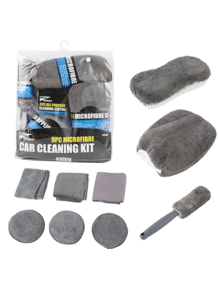 9-ти предметный комплект для мойки автомобиля из микрофибры — это незаменимый помощник в уходе за машиной. Благодаря разнообразию аксессуаров, вы сможете выполнить комплексную чистку: мягкая варежка и губка идеально подходят для бережного мытья кузова, аппликаторы помогут равномерно нанести полироль или воск, а салфетки из микрофибры прекрасно справятся с протиркой стёкол и зеркал. Щётка с ручкой предназначена для труднодоступных мест и дисков колёс. Использование микрофибры гарантирует эффективное удаление грязи и пыли без риска повредить поверхность. Материал обладает высокой впитывающей способностью, быстро сохнет и служит дольше традиционных тканевых средств. Такой набор универсален — его можно использовать не только для машины, но и для ухода за мотоциклом, велосипедом или домашней техникой. Экономьте время и деньги, поддерживая автомобиль в идеальной чистоте.