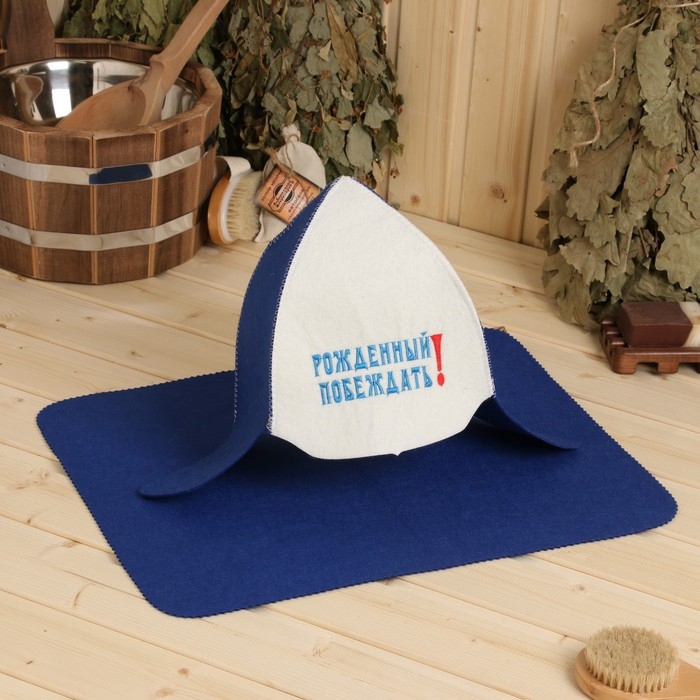 Набор для бани: шапка и коврик "Рожденный побеждать" синий