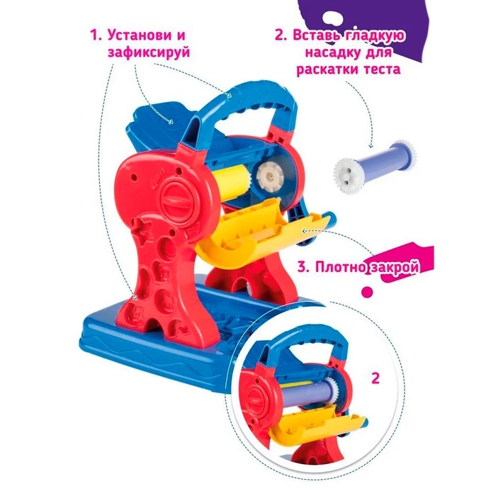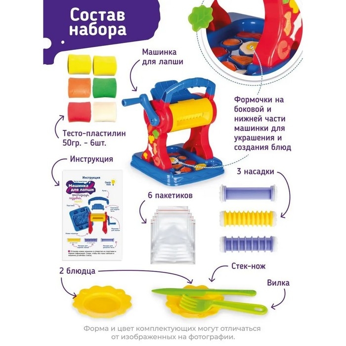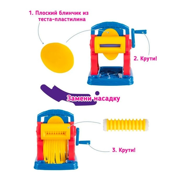 С набором для детской лепки «Машинка для лапши» можно сделать пасту собственного приготовления! Приготовьте лапшу разной толщины, добавьте к ней игрушечные морепродукты, мясо или овощи — и получите собственное авторское блюдо, которое никого не оставит равнодушным.