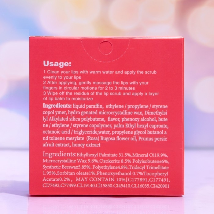 Состав скраба: этилгексилпальмитат, минеральное масло, микрокристаллический воск, озокерит, полиизобутен, синтетический пчелиный воск, полиэтилен, тридецилтримеллитат, олеат сорбитана, феноксиэтанол, витамин Е, может содержать: C177891, C177491. CI77492,C77499.Cl19140, Cl15850, Cl45410, Cl16035, Cl420901