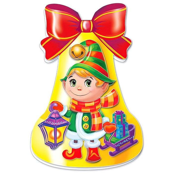 - В набор входят все необходимые материалы: две половинки колокольчика, красочные изображения гномика, санок с подарками и фонаря.