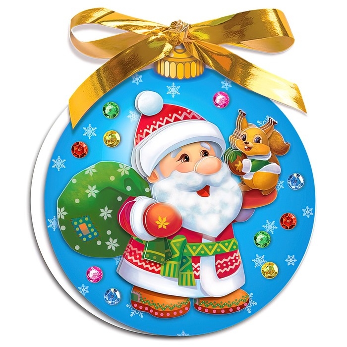 Открытка с изображением фигурки Деда Мороза с мешком подарков и белочкой на руке станет ярким акцентом на ёлке, сохраняя теплые слова поздравления. Набор включает все необходимые материалы, включая двусторонние клейкие квадратики скотча для легкого и удобного декорирования.
