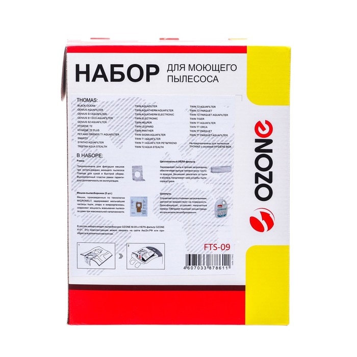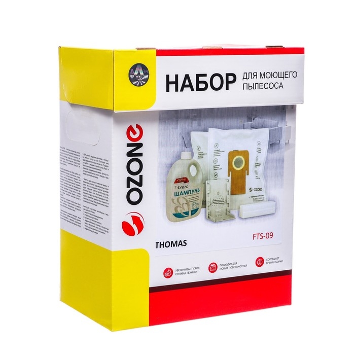 Набор для моющего пылесоса Thomas FTS-09 включает рамку-держатель пылесборника, 5 пылесборников, HEPA-фильтр и шампунь для моющего пылесоса объёмом 1 литр.