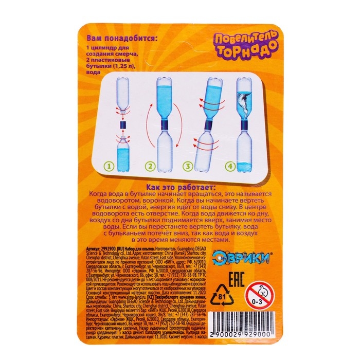 С набором торговой марки «Эврики» ребёнок познакомится с условиями образования торнадо и попробует самостоятельно создать смерч с помощью двух пластиковых бутылок.