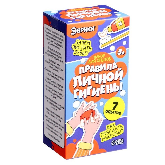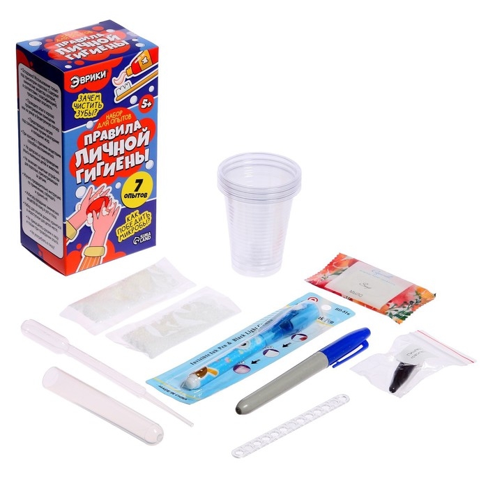 Набор для опытов «Правила личной гигиены» поможет родителям рассказать детям о важности элементарных правил поддержания здоровья. С помощью 7 увлекательных и познавательных экспериментов, дети смогут запомнить, как избегать микробов, бороться с кариесом и поддерживать здоровье зубов.