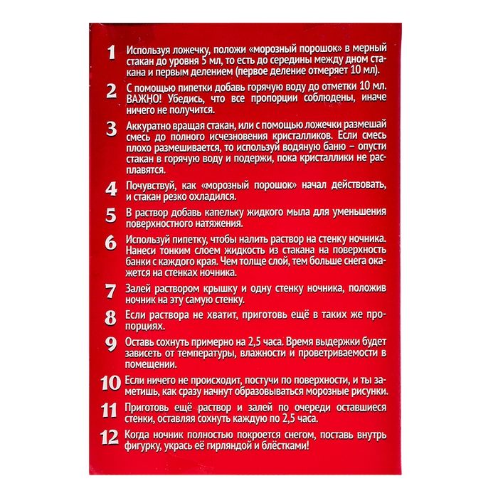 - В мерном стакане смешайте 2 г морозного порошка и 10 мл горячей воды.