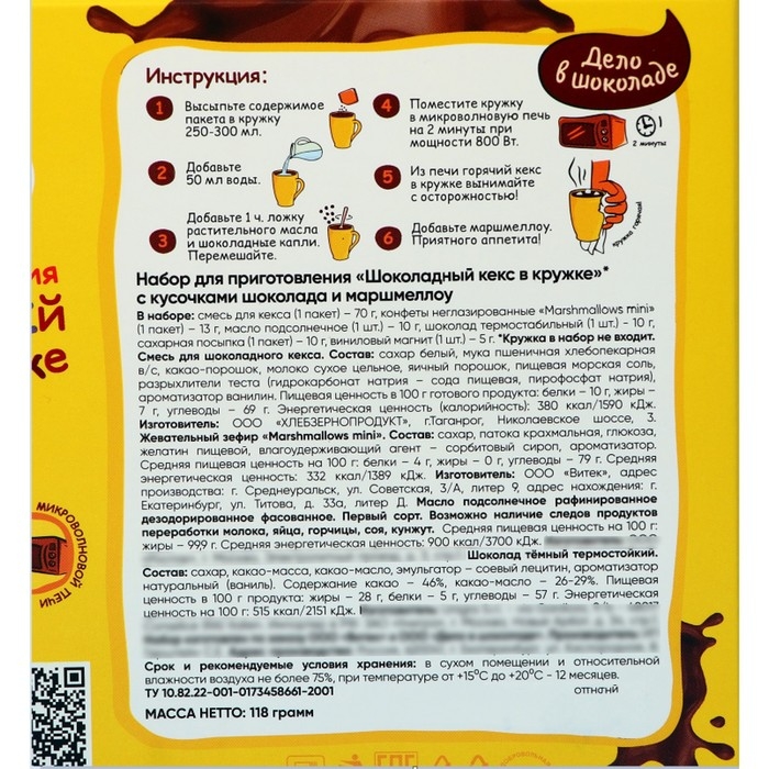 Набор для приготовления Шоколадный кекс в кружке с маршмеллоу, 118 г