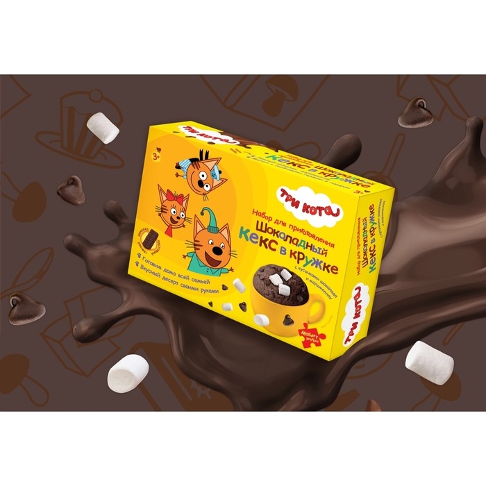 Приготовьте вкусный и сладкий шоколадный кекс в кружке с маршмеллоу с помощью кондитерского набора "Три кота". Для самостоятельного приготовления вкусного напитка своими руками в домашних условиях. Во время приготовления напитка ребенок развивает мелкую моторику и самостоятельность, так как он будет своими руками распаковывать пакетики и смешивать напиток с шоколадными каплями, учиться без помощи родителей по простой инструкции делать шоколадный кекс. Такой кондитерский набор - отличный и вкусный подарок на любой праздник.