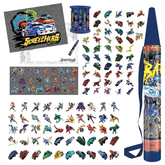 Набор для рисования 114 предметов в пластиковом тубусе 74 х 9 х 9 см "Дикие Скричеры" (восковые карандаши 12 цветов + наклейки + блокнот)