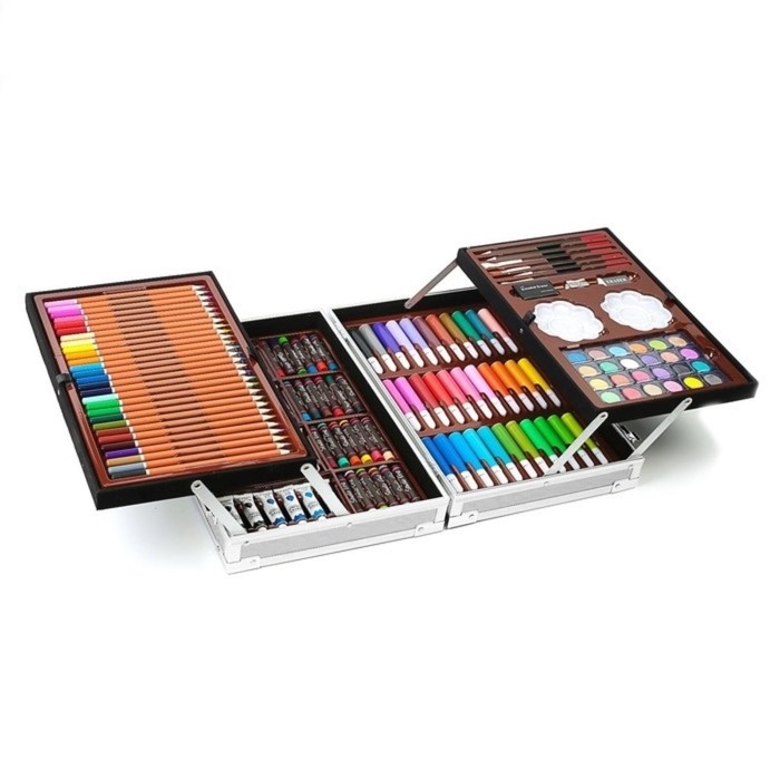 Набор содержит: Широкий ассортимент цветных карандашей, цветные фломастеры, пастель, акриловые краски, акварель, 2 простых карандаша и 4 кисти разной формы и размера. В наборе есть разнообразные канцтовары для удобной и практичной работы: Ластик и ластик клячка, точилка и 2 палитры. Набор подойдёт для разных художественных работ, от живописи до скетчинга. Удобный раскладной портфель, можно носить набор на учёбу, или на выезд. металлическая оболочка продлит срок жизни набора. Отличный выбор для опытного художника.