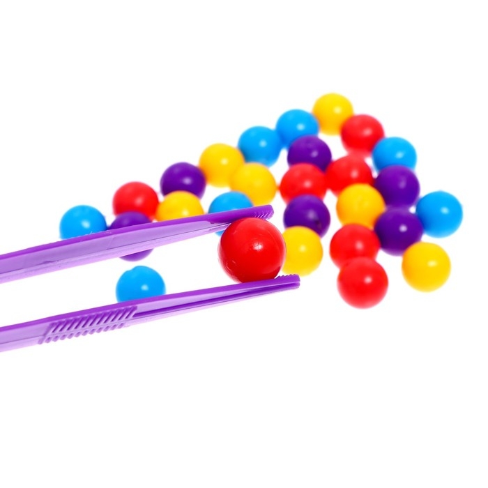 - Попросите малыша с помощью пинцета рассортировать шарики по количеству или цветам.