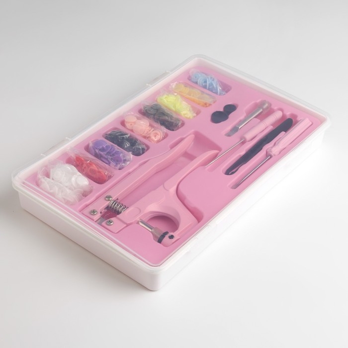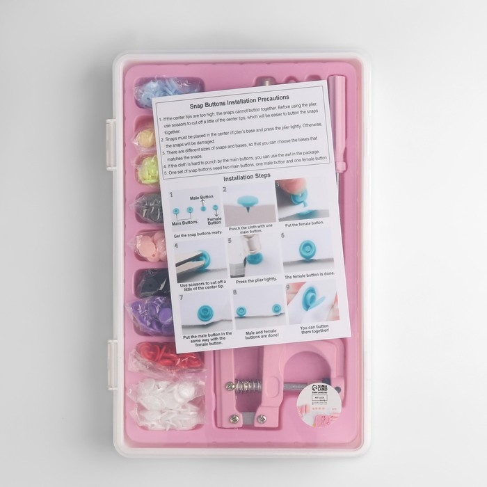 Набор для установки пластиковых кнопок является универсальным и подходит как для рукоделия, так и для решения бытовых вопросов.
