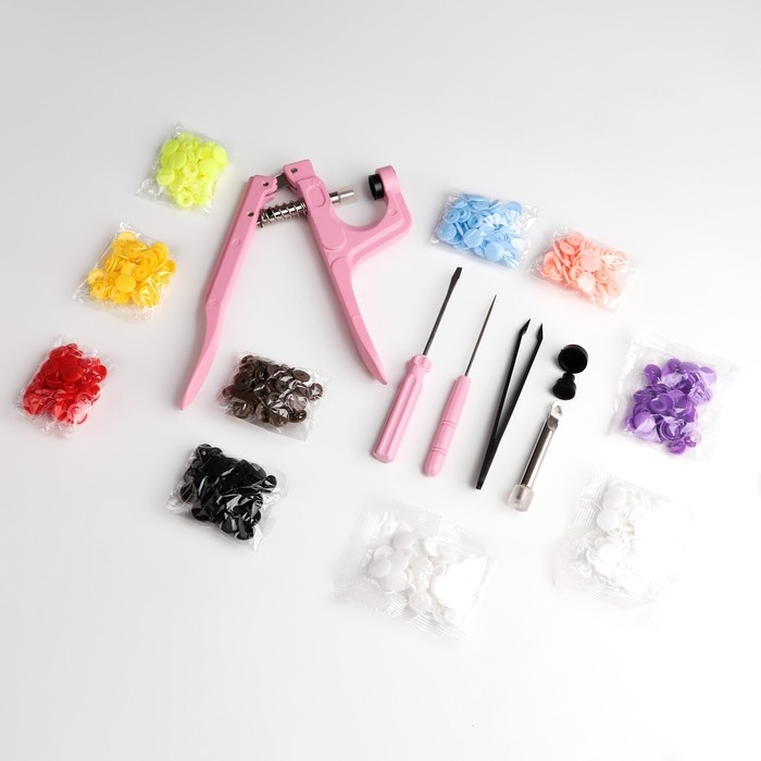 В комплекте есть всё необходимое, включая кнопки в 10 разных цветах. Чаще всего их используют для одежды, постельного белья, конвертов, ежедневников, альбомов из бумаги, ткани, искусственной кожи.