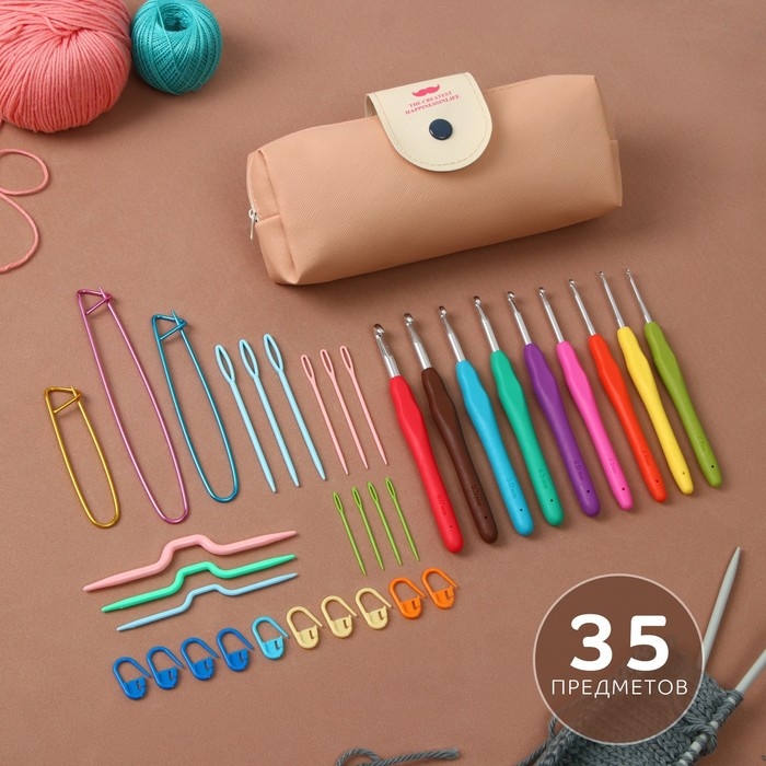 Набор для вязания, 35 предметов, в пенале, 20 × 10,5 × 4 см, цвет розовый