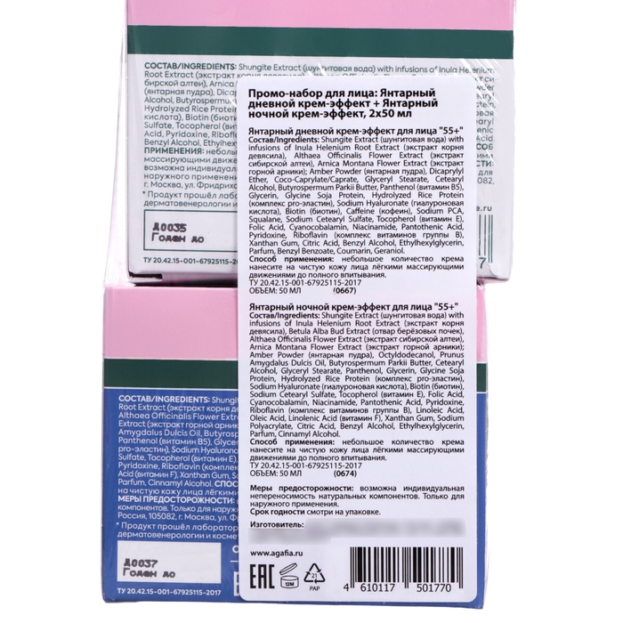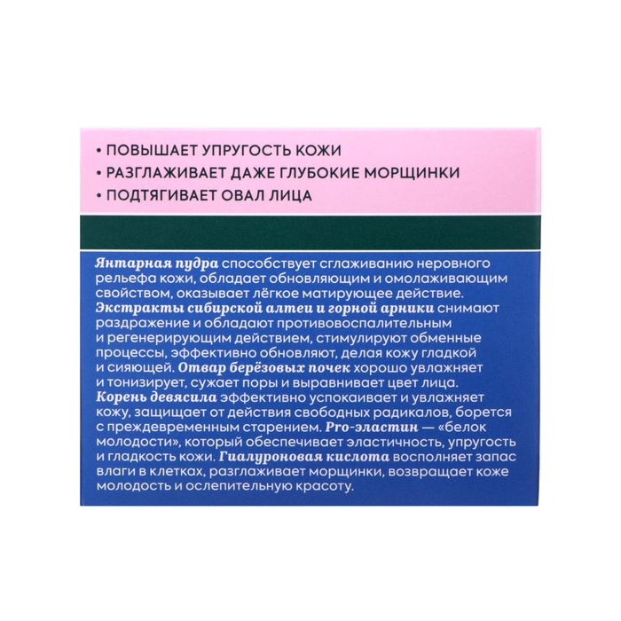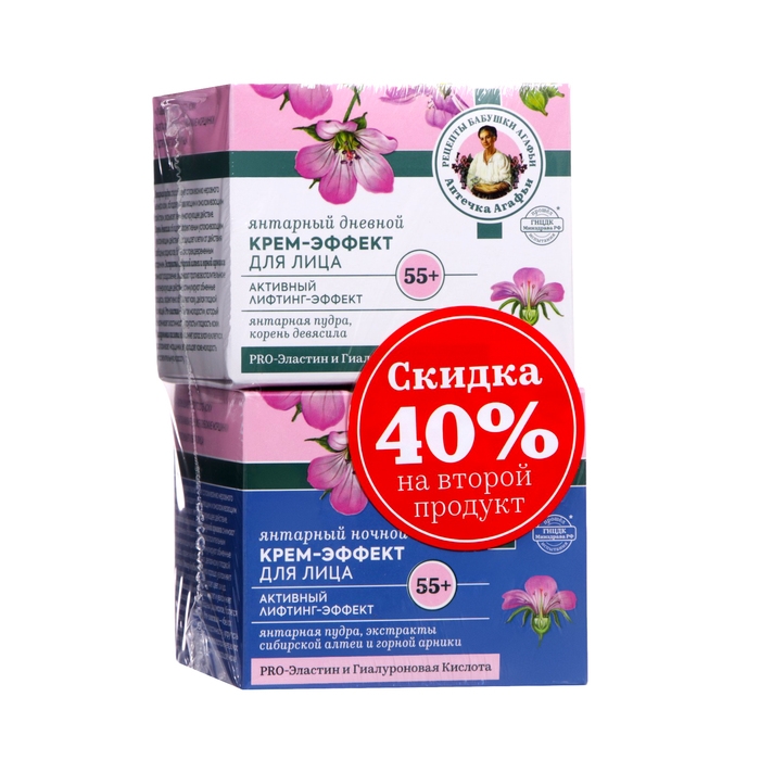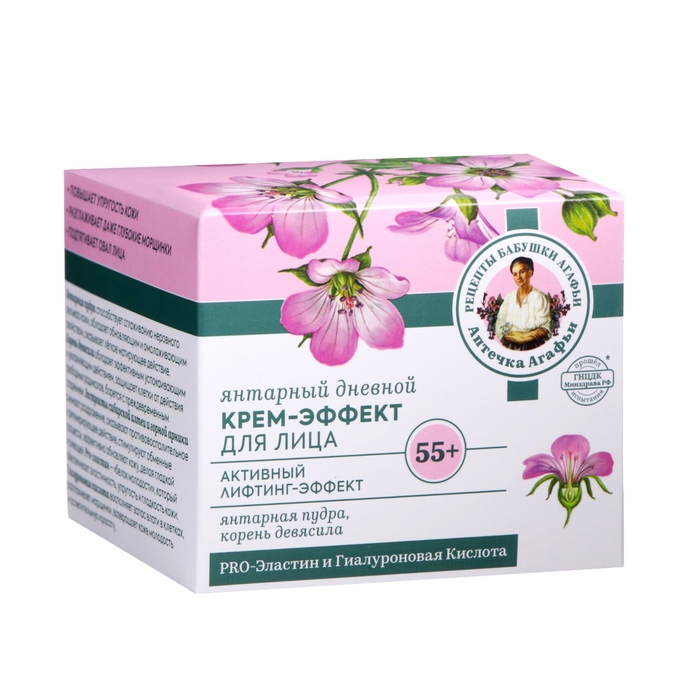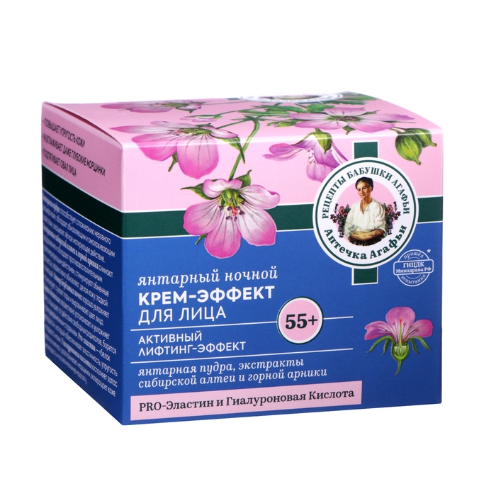 Янтарный дневной крем-эффект для лица 55+ Активный лифтинг эффект. Стимулирует процесс регенерации клеток и интенсивно восстанавливает кожу на всех уровнях, ускоряет клеточное обновление, активизирует образование коллагена и помогает бороться с основными признаками возраста: морщины, потеря упругости, неровный тон, тусклый цвет лица. Кожа становится мягче, выглядит более сияющей, её тон и текстура выравниваются, морщины и несовершенства сокращаются. Янтарный ночной крем-эффект для лица 55+ Активный лифтинг эффект.