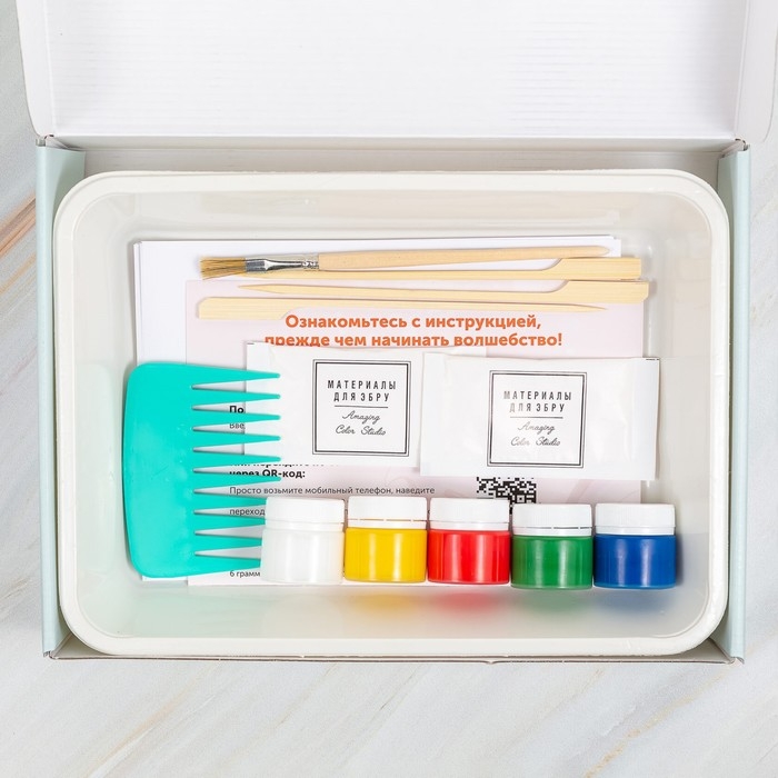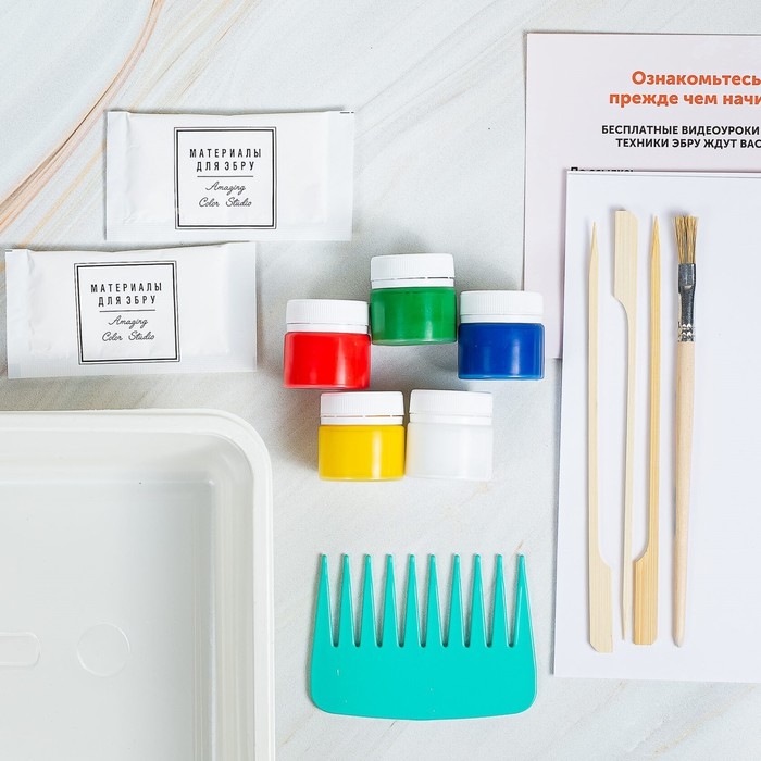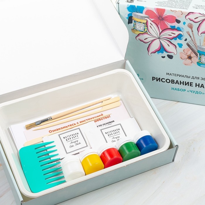 Набор для рисования эбру: краски 6 цв по 6 мл, 10 листов бумаги, загуститель 10 г, инструменты, поддон