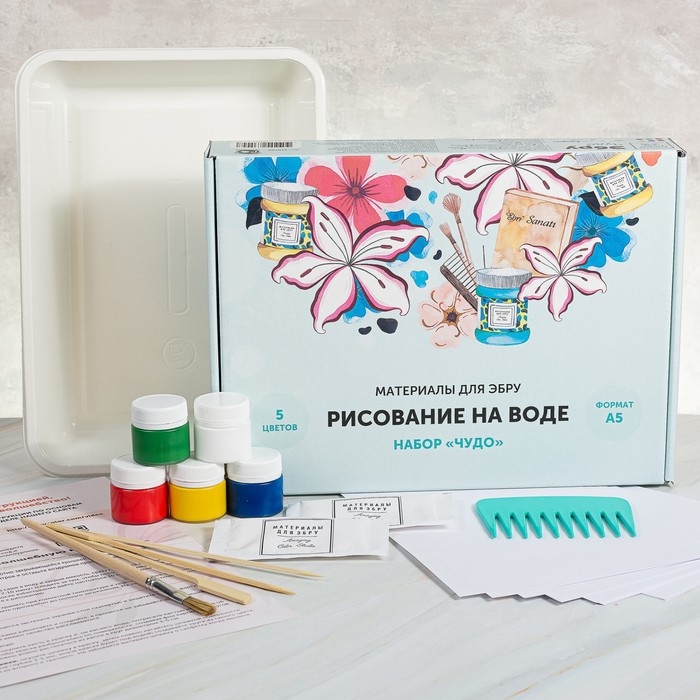 Набор «Эбру-чудо» имеет полноценный состав и его хватит для того, чтобы увидеть свое маленькое чудо в технике рисования на воде и научиться простым основам эбру. Формат ванночки — А5.