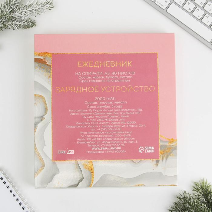 В набор входит ежедневник на спирали формата А5 (40 листов) и зарядное устройство 2000 mAh. В комплекте к внешнему аккумулятору идёт отдельный шнур для разъема USB и micro USB. Подходит для пополнения заряда аккумулятора мобильных телефонов, планшетов, MP3-плееров, цифровых фотокамер и других устройств.