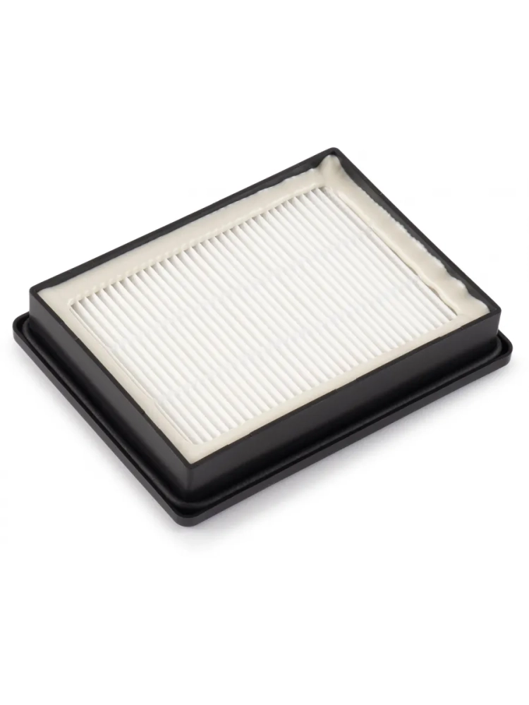 Внешний HEPA-фильтр изготовлен из тонких волокон, уложенных в несколько слоев в пластиковый корпус. Устанавливается в месте выхода воздуха наружу из пылесоса чтобы задерживать мелкие частицы пыли.