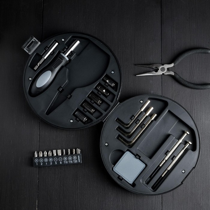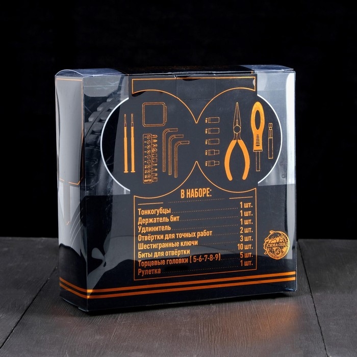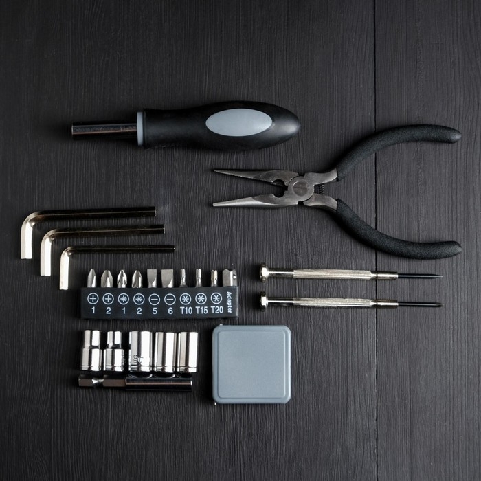 Биты, Держатель бит, Отвёртка, Рулетка, Тонкогубцы, Торцевая головка, Удлинитель, Шестигранник
