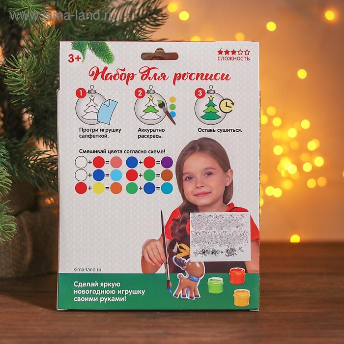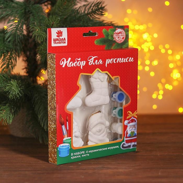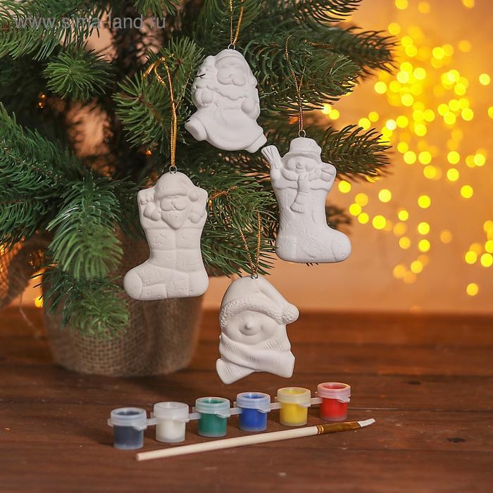 Набор из 4 ёлочных украшений под раскраску «Сказка» с подвесом, кистью и краской, 6 цветов по 2 мл