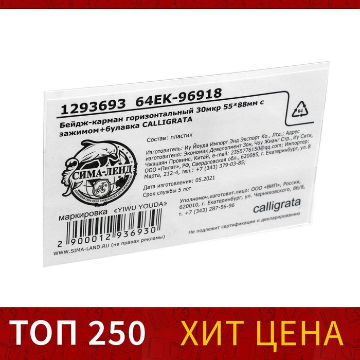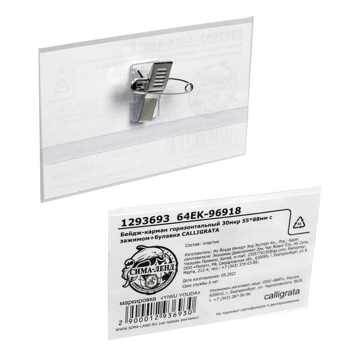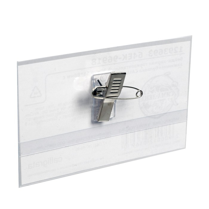 Набор из 50 штук, бейдж - карман горизонтальный (внешний 88 х 55мм), внутренний 88 х 53мм, 30мкр, с зажимом + булавка